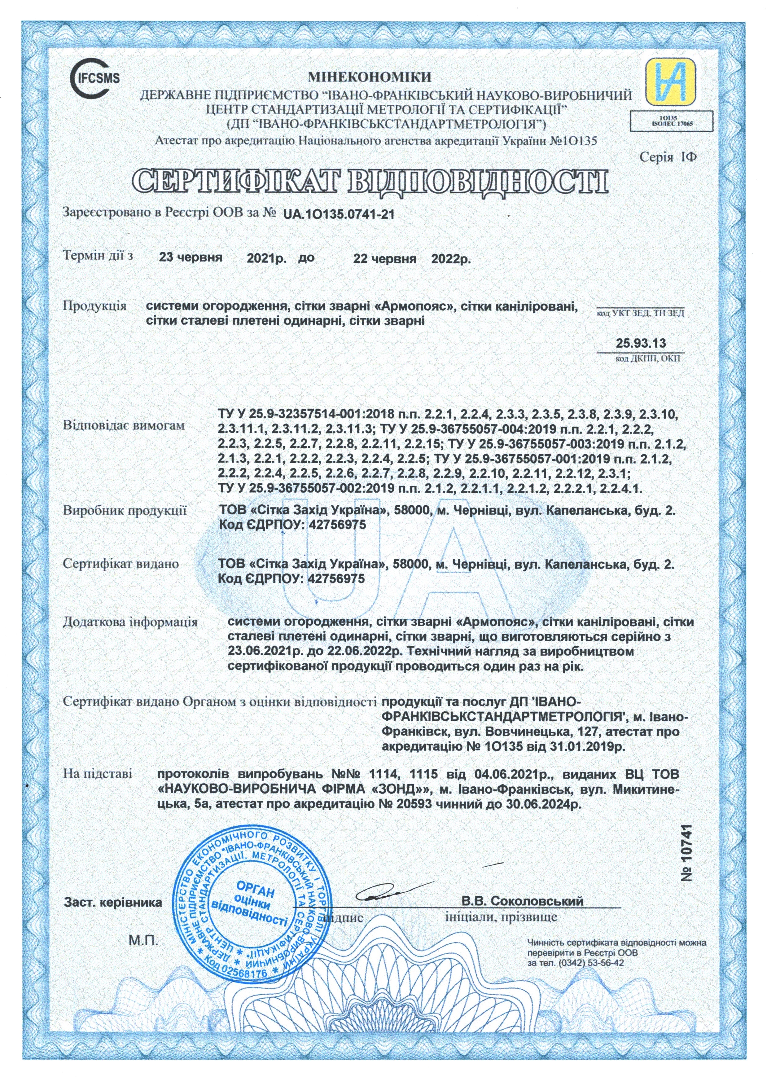 На всю продукцію компанії "Сітка Захід" є сертифікати якості